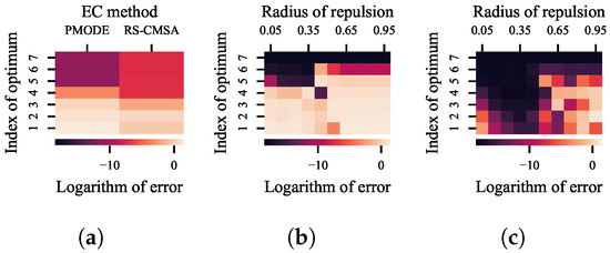 Heat maps of the average error of 100 runs of different niching methods or LRDE with different radii of repulsion for each optimum of the test function. (a) RS-CMSA and PMODE. (b) LRDE. (c) LRDE integrated with NDDCHE in omniscient mode.