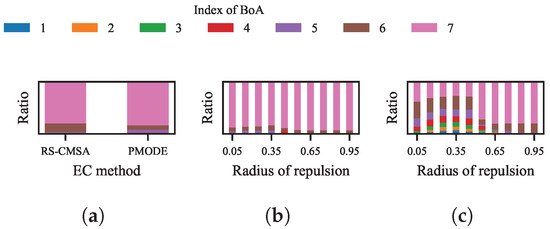 The ratio of evaluations spent by different niching methods or LRDE with different radii of repulsion in each BoA to the total evaluations. (a) RS-CMSA and PMODE. (b) LRDE. (c) LRDE integrated with NDDCHE in omniscient mode.