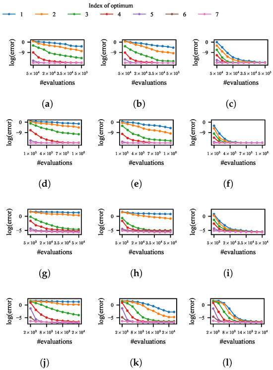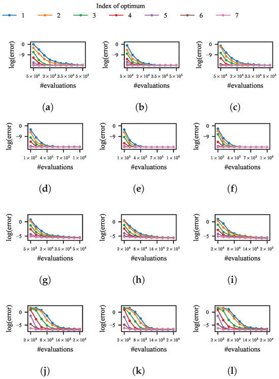 Variation of the average error of 100 runs of different niching methods with different restart strategies for each optimum of the test function with the evolution. (a,d,g,j) Niching methods with constant population size. (b,e,h,k) Niching methods with increasing population size. (c,f,i,l) Niching methods with NDDCHE and constant population size. (a–c) kNPSO. (d–f) NSDE. (g–i) NEA2. (j–l) HillVallEA.