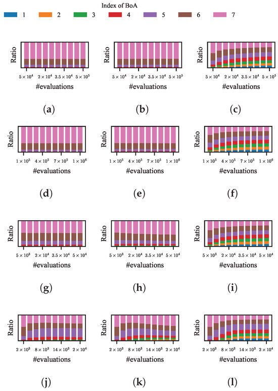 Nonetheless, the limitations previously discussed regarding LRDE are also evident in the four methods currently under examination. This can be observed from the corresponding variation of the ratio of evaluations spent by these methods in each BoA during the evolution, which is shown in Figure 9a–h. For kNPSO, NSDE, and NEA2, the significant imbalance between evaluations in each BoA almost remain unchanged during the evolution regardless of whether the population size doubled or not at each restart. As for HillVallEA, although the imbalance decreases a bit at the early stage of evolution, it soon keeps unchanged or even increase at the later stage.