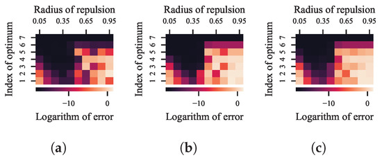 Heat maps of the average error of 100 runs of LRDE integrated with NDDCHE in different modes with different radii of repulsion for each optimum of the test problem. (a) Omniscient mode. (b) Half-heuristic mode. (c) Heuristic mode.