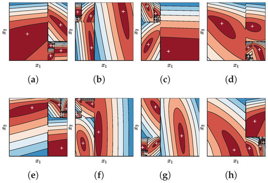 Contour lines of fitness of the eight test problems with seven optima. The locations of the optima are denoted by white crosses. (a–h): F1 to F8.