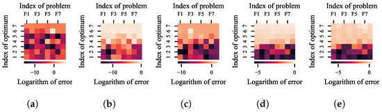 In this heat map, each column corresponds to a niching method. The color of grid in a specific column denotes the average value of the logarithmic error to the corresponding optimum. According to Equation (7), the smaller the index of an optimum, the smaller the size of its BoA. So the results clearly indicate that, for both RS-CMSA and PMODE, the smaller the size of a BoA, the lower the probability of locating the optimum in it.