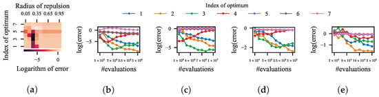 After 100 independent runs of LRDE with the radius of repulsion set to different values, where the maximum number of evaluations is set to 50,000 and the population size is set to 20, the error for each optimum is shown in Figure 6b. Each column shows the result of LRDE with a specific value of the radius of repulsion. The results prove that, by setting the threshold distance for radial repulsion within a more suitable range, which is around in the experiment, a better performance can be achieved. However, although setting the radius of repulsion to makes LRDE competitive with the two state-of-the-art niching methods, it is still hard to further improve it by finding a more suitable value of the radius of repulsion, especially in practical cases.