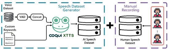 Typically, data augmentation entails generating new data by applying subtle modifications to the original dataset, thereby expanding the volume of training data for model development. In contrast, this study employs the publicly available AISHELL-3 dataset [14] as the source for target audio files. We apply VAD technology to concatenate speech segments from these files, ensuring compliance with the 10 s uninterrupted speech requirement recommended by XTTS [6]. Next, we generate synthetic speech using a customized keyword list. This is followed by integrating a small set of real human-recorded keyword speech samples with the synthetic data to complete the augmentation process, facilitating subsequent model training. The detailed architecture is illustrated in Figure 2.