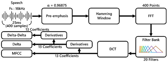 Next, Mel-Frequency Cepstral Coefficients (MFCCs) were extracted as the primary features, supplemented by Delta and Delta-Delta dynamic features to capture temporal variations and enhance expressiveness. As illustrated in Figure 4, the extraction process involves the following steps: the audio signal is first pre-emphasized with a coefficient of 0.96875 to enhance high-frequency components; it is then segmented into 25 ms frames (400 samples) with 50% overlap; each frame undergoes a 400-point Fast Fourier Transform (FFT) to convert it to the frequency domain, followed by mapping to 20 Mel filter banks; the filter bank outputs are logarithmically compressed and transformed via a Discrete Cosine Transform (DCT) to yield 13 static cepstral coefficients; and Delta and Delta-Delta features are then computed, resulting in a total of 39 coefficients per frame.