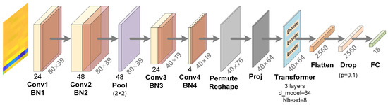 To enhance sequential speech feature modeling, we propose a CNN-Transformer hybrid architecture, as shown in Figure 7, integrating a CNN feature extractor, a format conversion module, and a three-layer Transformer encoder to combine local and global feature modeling. The CNN module includes four convolutional layers with 24, 48, 24, and 4 filters, respectively, each using 3 × 3 kernels, stride 1, padding 1, and batch normalization after each layer. A 2 × 2 max-pooling layer after the second convolution reduces the feature map from 80 × 39 to 40 × 19, lowering computational complexity. The output is processed through Permute and Reshape layers into a sequence and projected to a 64-dimensional embedding space . The Transformer encoder, with three layers, each containing 8 attention heads and a 128-dimensional feedforward network , applies a 0.1 dropout rate to prevent overfitting, capturing long-range dependencies to enhance speech pattern recognition. Finally, features are flattened and passed through a fully connected layer for 16-class prediction, optimized with Adam, and processed via a Softmax function to compute class probabilities, with the highest probability determining the result. The detailed layer structure is presented in Table 2.