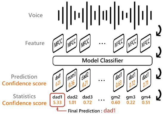 Here, represents the total number of windows, and denotes the probability of category for the -th window. The category with the highest confidence score is selected as the final prediction result. The detailed process is illustrated in Figure 8. When given an input speech segment, we apply a 50% overlapping sliding window to segment the signal and extract multiple MFCC feature sequences. These feature segments are then individually fed into the classification model to generate prediction results along with corresponding confidence scores. To obtain a robust final prediction and mitigate any confusion caused by repetitive or similar-sounding keywords, we accumulate the confidence scores of each class across all segments. The class with the highest total confidence score is selected as the final output.
