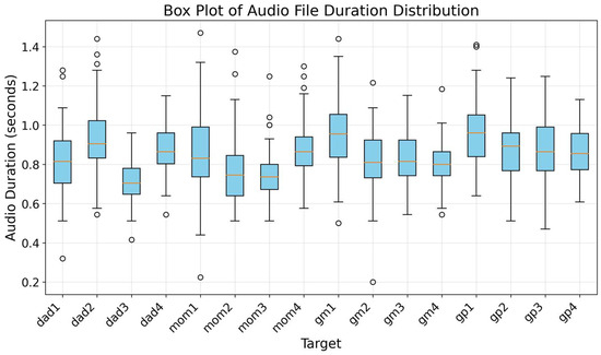 Figure 9 displays the audio file duration distribution, revealing that the durations of the insult phrases are consistently under 1.5 s, with a median duration of approximately 1.2 s across categories. The interquartile range (IQR) spans from 1.0 to 1.4 s, indicating that 50% of the samples fall within this range, while the maximum duration reaches 1.47 s, with minimal outliers. This uniformity in short durations supports the dataset’s consistency, confirming the reliability of the recorded insult phrases for model training.