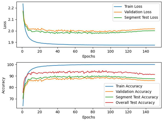 The test set in this section consists of a mixture of RHS and synthetic speech data, split into a 7:1:2 ratio for training, validation, and testing, respectively. This was paired with 5-fold cross-validation, where training and validation data accounted for 80%, and the test set comprised 20%, with swapping performed to assess model robustness. The results, presented in Figure 10, Figure 11 and Figure 12, indicate that the average test accuracy for segmented data reached 88.92%, with the average loss reduced to 1.9873. Following adjustments with the statistical mechanism, the overall average test accuracy further improved to 93.35%. From validation to testing, the statistical mechanism effectively mitigated classification errors due to lexical similarities between categories, significantly enhancing the model’s recognition accuracy. These results demonstrate the classification model’s high efficiency and robust performance in a mixed-data environment.
