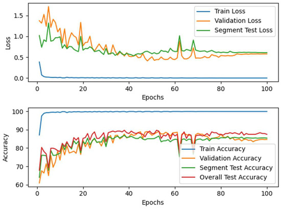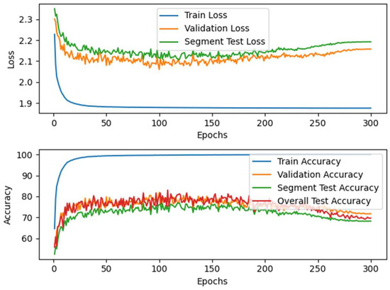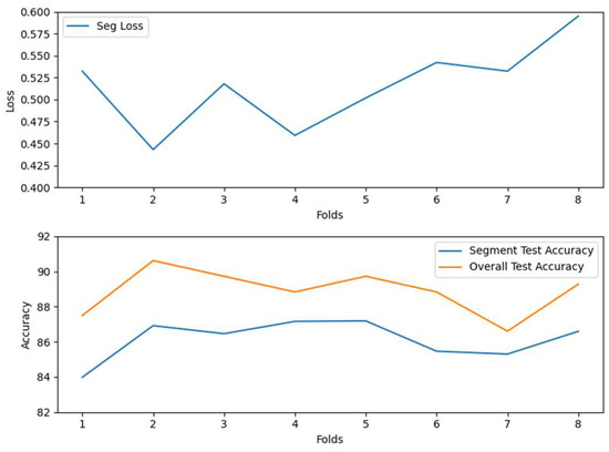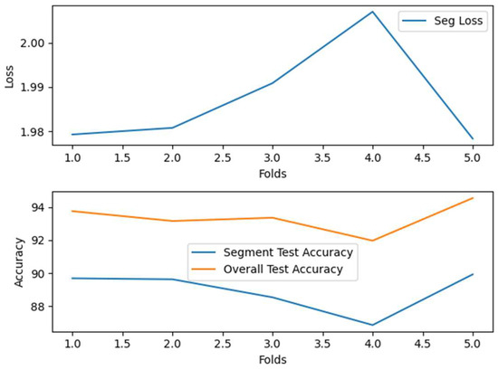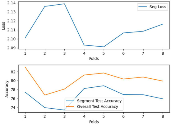 After optimizing dataset ratios with synthetic speech data, the model’s accuracy significantly improved. We further analyzed performance using sliding window and confidence score statistical mechanisms alongside cross-validation. As shown in Figure 14, the average test accuracy for segmented data reached 76.46%, with a mean loss of 2.1114, improving to 80.36% after applying the confidence score mechanism. Figure 14 demonstrates that the post-adjustment sequence accuracy significantly surpasses the segmented accuracy, indicating the effective correction of local classification errors. Additionally, Figure 15 shows that the confidence score mechanism enhances accuracy across all cross-validation folds, enriching feature data and significantly improving the model’s generalization and classification accuracy.
