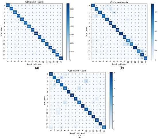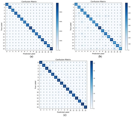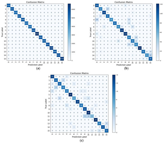 Confusion matrix analysis of Proposed-I: (a) Training, (b) validation, and (c) test. Several categories exhibit near perfect classification with minimal confusion, indicating stable recognition performance on real speech.