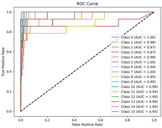 AUROC analysis of Proposed-I on the test set. Most categories reach near perfect AUC values, demonstrating the model’s stable discrimination even with overlapping features. The dotted line represents the baseline; the closer the solid line is to the dotted line, the poorer the classification performance.