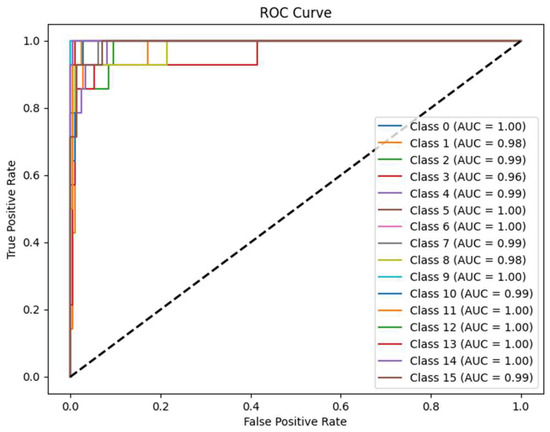 We evaluated the classification performance of the Propose-I model using a confusion matrix and AUROC curves. As shown in Figure 16, the training set’s performance aligns with the mixed dataset results reported earlier, while the validation and test sets, comprising only RHS, exhibit slightly lower accuracy due to differences between synthetic and real speech. This use of RHS for validation and testing enhances the model’s practical applicability. The confusion matrix reveals near-zero classification errors for categories 5, 10, and 12, indicating strong discriminative ability. Additionally, Figure 17 presents AUROC curves, with most categories achieving AUC scores near 1.00, confirming the model’s robust stability across classification thresholds.