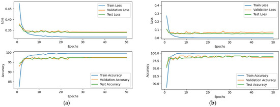 Loss and accuracy of (a) Proposed-I and (b) Proposed-II in real vs. synthetic speech identification. Both models demonstrate rapid convergence and low loss, confirming their efficiency in distinguishing between real and synthetic speech.