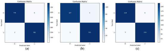 Confusion matrix of Proposed-II in real vs. synthetic speech identification: (a) Training, (b) validation, and (c) test. The model exhibits fewer misclassifications and achieves 98.66% accuracy, outperforming Proposed-I.
