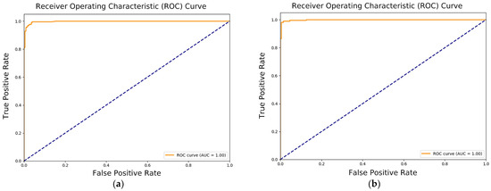 Previous experiments revealed that an excessively high proportion of synthetic speech data degrades model performance on the RHS dataset. To investigate this phenomenon, we employed Proposed-I and Proposed-II, without statistical mechanisms, on a combined RHS and synthetic speech dataset, with labels redefined as “real” or “synthetic” to learn feature distinctions. As shown in Figure 22, both Proposed-I and Proposed-II exhibit rapid convergence and low loss. Proposed-I achieved 97.54% accuracy on the mixed test set, with its confusion matrix (Figure 23) indicating consistent classification across training, validation, and testing. Proposed-II outperformed it, achieving 98.66% accuracy, with its confusion matrix (Figure 24) showing superior consistency. The AUROC curves indicate consistent result distribution due to the absence of statistical mechanisms. Proposed-II performed even better, achieving an accuracy of 98.66%, with its confusion matrix being consistent with previous experiments and superior to Proposed-I in showing results. The AUROC curves in Figure 25 confirm both models’ exceptional ability to distinguish real from synthetic speech, demonstrating significant feature-level differences. These results suggest that excessive synthetic speech impairs real speech identification accuracy. This approach validates real–synthetic speech distinguishability and supports applications like detecting fraudulent impersonation in voice authentication systems, enhancing security and reliability.