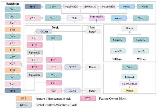 The target detection algorithm of FFG-YOLO was built in an enhanced YOLOv8n architecture. Comprising backbone, neck, and head components, FFG-YOLO introduced four key improvements over the original YOLOv8n: (1) FEBs inserted after the C2f modules in backbone layers 2, 4, and 6 to capture contextual information and enrich small-target feature semantics; (2) replacement of concat modules with FCBs in neck layers 14, 11, 17, and 20 to boost cross-layer semantic fusion efficiency; (3) using GCABs before the three detect layers to enhance small-target discrimination via global context modeling; and (4) integration of the WDLoss function to optimize bounding box regression (