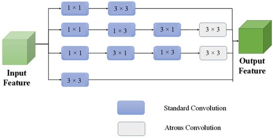 26]. The convolutional structure of multiple branches discriminates and extracts the semantic information of small targets on multiple scales. The FEB module in the convolutional structure constructs feature extraction paths in different receptive fields for the extraction of different context information. The structure of the FEB module included four branches, one of which was used as a residual mapping branch, adopting a 1 × 1 convolution to maintain the original information of the input features (