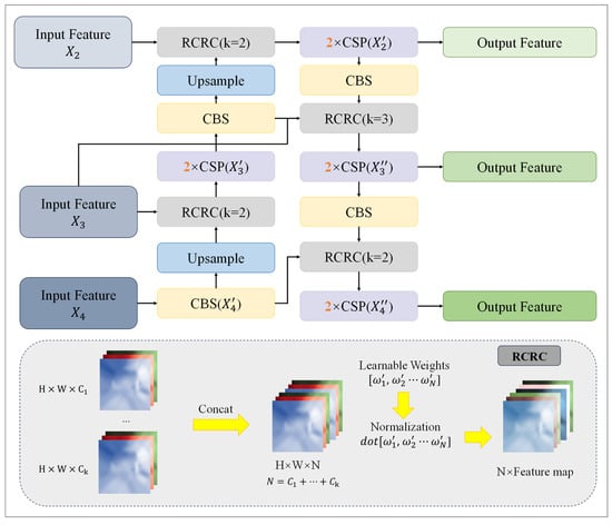 26]. To address this, we introduced the refined cross-scale connections (RCRC) strategy to the FCB module. Through normalization, RCRC adjusted the contribution level of multi-scale feature maps along the channel dimension to address the “shared-channel-weight” problem. In the FCB module, RCRC normalizes weights by using the total number of channels using the following equation.