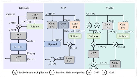29]. The third branch used a 1 × 1 convolution to simulate the query and key matrix. The first and third branches were multiplied by the second branch matrix. The cross-channel and spatial contextual information fusion was conducted by generating the channel attention weights using Softmax. Finally, the final output of the spatial and channel attention mechanism (SCAM) was obtained by fusing cross-channel and spatial contextual features through broadcast Hadamard channels. The cross-space pixel semantic information at each layer is represented as follows: