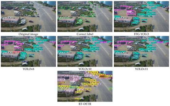 FFG-YOLO demonstrated superior detection performance in most categories, particularly for dense crowds and variant patterns. Specifically, its mAP reached 39.3% for pedestrians and 31.3% for other people, significantly outperforming YOLOv8 (36.7 and 29.5%) and YOLOv11 (35.6 and 28.7%). This highlighted the strong feature perception and segmentation capabilities of FFG-YOLO in the dense distribution of objects and significant occlusion. The advantage stemmed from the model’s FCB and FEB, which enhanced fine-grained feature extraction and semantic fusion and improved pedestrian target recognition. FFG-YOLO demonstrated exceptional performance in vehicle detection, with an mAP@50 of 78.5% for cars and 40.5% for vans, the highest among all models. For cars, FFG-YOLO showed a 2% higher mAP@50 than YOLOv8, highlighting the robust detection of large vehicles. While the detection accuracies for trucks and buses were slightly lower than those of RT-DETR, such a difference is acceptable given the model’s lightweight design. For non-motorized vehicles, FFG-YOLO showed an mAP@50 of 9.9% for bicycles, 22.0% for tricycles, and 41.2% for motorcycles. Notably, for vehicles, FFG-YOLO’s mAP@50 was 41.2%, outperforming YOLOv8 (38.9%) and RT-DETR (36.8%). This evidenced an accurate detection of fast-moving small targets. Although bicycle detection ability was worse than that of RT-DETR (14.0%), FFG-YOLO surpassed YOLO models in detecting awning-tricycles.