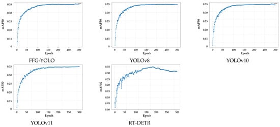 Figure 6. These curves illustrate each model’s optimization speed and accuracy. FFG-YOLO and other YOLO-series models exhibited fast convergence, with mAP@50 rapidly increasing in early iterations and stabilizing later. This indicates strong optimization ability and high detection accuracy from an early stage. Though YOLOv10 and YOLOv11 showed minor fluctuations in later stages, their mAP@50 remained stable, achieving high accuracies that reflect robust feature representation and target localization. In contrast, RT-DETR showed a slower initial mAP@50 increase and significantly lower convergence speed than YOLO-series models. Its limited accuracy improvement and suboptimal final mAP@50 suggest potential optimization challenges, possibly due to insufficient learning efficiency or suboptimal parameter tuning.