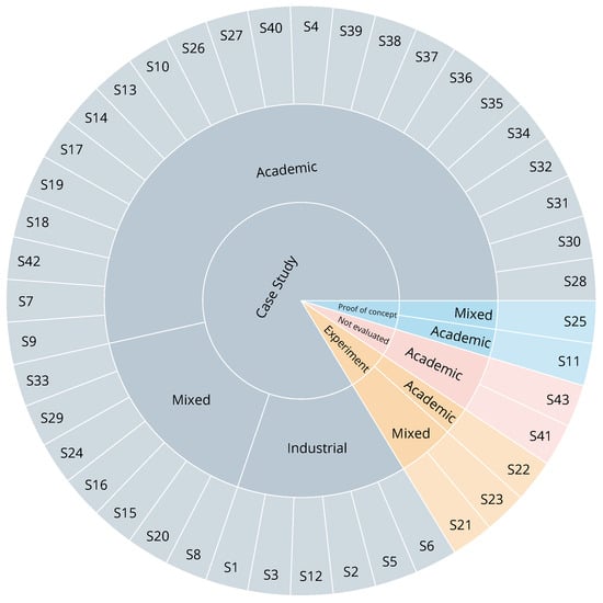To address RQ2, we conducted a comparative analysis of the evaluation methods employed by the primary studies, focusing particularly on the case study approach and its application in different domains. Of the 43 studies selected in our mapping, 33 (i.e., 76.74%) underwent evaluation based on at least one application domain. In contrast, 10 studies (i.e., 23.26%) did not explicitly present an application domain, thereby precluding their classification in our mapping. This was performed in order to avoid introducing any bias (i.e., S15, S16, S18, S23, S26, S28, S31, S35, S41, and S43). As only one area (i.e., Information Systems) was identified in our mapping, Figure 3 illustrates the distribution of the studies in our mapping, considering the area, domain, application domain [65], and quantity.