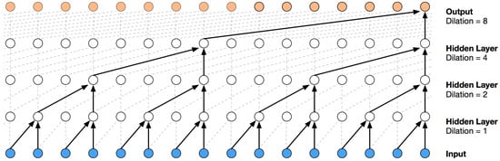 Visualization of a stack of dilated causal convolutional layers (Wavenet, 2016) reprinted from ref. [].