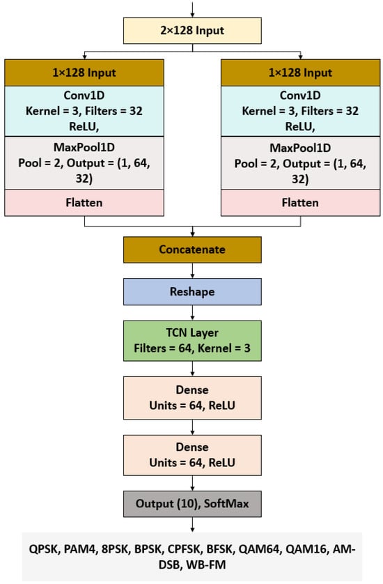 The proposed architecture, a Complex-Valued CNN-TCN, was designed to process IQ data directly as complex-valued inputs, leveraging their inherent structure for effective feature extraction and classification. The input layer accepts data in the form of 2 × 128, representing the in-phase (I) and quadrature (Q) components, which are transformed into a complex representation to preserve the spatial and temporal correlations. The architecture incorporates two parallel convolutional pathways, each comprising 32 filters with a kernel size of 3, applied independently to the I and Q components. This design facilitates the capture of unique features from each component while ensuring nonlinear patterns are extracted using ReLU activation. Max-pooling layers with a size of 2 follow the convolutions to reduce dimensions and emphasize dominant features. The outputs of the convolutional blocks are flattened and concatenated, forming a unified feature representation. These features are then passed through a TCN block, which captures long-range dependencies in the data, enabling the model to learn temporal relationships critical for classification tasks. The architecture concludes with dense layers, employing softmax activation for classification. An overview of the proposed model is illustrated in Figure 3.