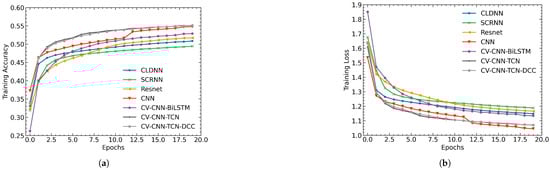 Comparison between (a) training accuracy and (b) training loss of different models in the RadioML2016.10b dataset.