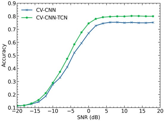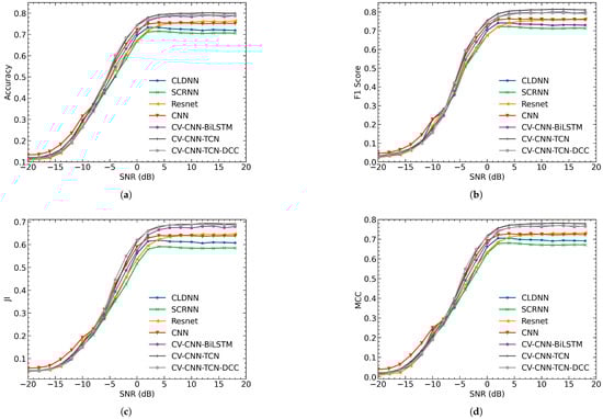 The CV-CNN-TCN and CV-CNN-TCN-DCC architectures outperform other models, such as CLDNN, SCRNN, ResNet, and CNN, across all SNR conditions, with the performance gap being most significant in low-SNR environments. At SNR = −10 dB, the CV-CNN-TCN achieves an accuracy of 37%, while the CV-CNN-TCN-DCC further improves to 40%. In contrast, the next-best-performing model, ResNet, only reaches 33%, and simpler models like SCRNN and CLDNN fall below 30%. This advantage becomes more pronounced when comparing metrics like the F1-score and MCC, where CV-CNN-TCN-DCC achieves 0.38 and 0.37, respectively, at SNR = −10 dB, compared to ResNet’s 0.34 and 0.33. These results, illustrated in Figure 5, emphasize that while traditional models struggle to generalize in noisy conditions, the inclusion of temporal and dilated causal convolutions in CV-CNN-TCN-DCC strengthens feature extraction and temporal representation.