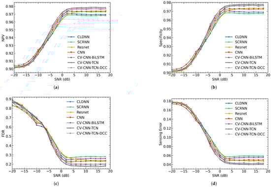 At moderate and high SNR levels, all models exhibit closer performance, yet CV-CNN-TCN-DCC consistently maintains a slight edge. For example, at SNR = 10 dB, CV-CNN-TCN-DCC reaches an NPV of 97.6% and a sensing error rate of 5.6%, outperforming ResNet, which achieves a sensing error of 6.8%. The false discovery rate (FDR) of CV-CNN-TCN-DCC is also the lowest among all models, declining to 20.1% at SNR = −5 dB, compared to 22.4% for ResNet and 24.3% for SCRNN.