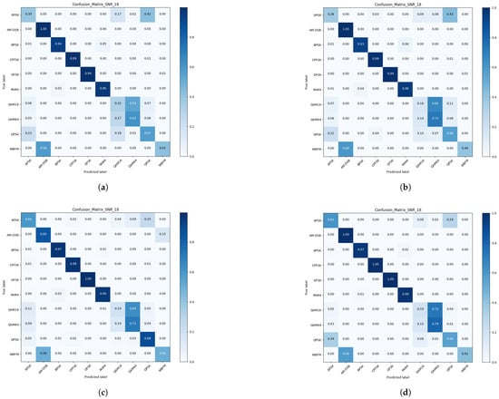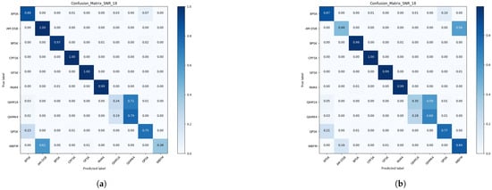 The performance of the proposed method is evaluated using several metrics, including classification accuracy, sensing error (SE), training accuracy, validation loss, validation accuracy, Matthew’s correlation coefficient (MCC), F1 score, Jaccard index (JI), noise value prediction (NPV), and false discovery rate (FDR) [,,]. Training accuracy measures the AMC model’s performance on the training dataset, reflecting how well the model classifies or predicts modulation types in training samples. Validation loss quantifies the error between the predicted and target modulation types in the validation dataset, while validation accuracy represents the percentage of correctly classified instances in the validation set [,]. The MCC metric, ranging from −1 to +1, assesses the effectiveness of binary classification models in AMC: +1 indicates perfect predictions, 0 suggests random guessing, and −1 implies completely incorrect predictions. The F1 score, which combines precision and recall, ranges from 0 to 1, with values close to 1 indicating better classification performance. The Jaccard index (JI) compares the similarity between predicted and actual modulation types, where 0 denotes complete similarity, and 1 indicates no similarity. The negative predictive value (NPV) measures the proportion of true negatives out of all negative predictions, indicating how often the model correctly identifies negative instances. The false discovery rate (FDR), on the other hand, represents the proportion of false positives out of all positive predictions, providing insight into the model’s tendency to incorrectly label instances as positive []. Sensing error (SE) in AMC refers to detection inaccuracies that may lead to incorrect modulation classifications and is calculated as the average of the miss detection probability () and false alarm probability () [,].