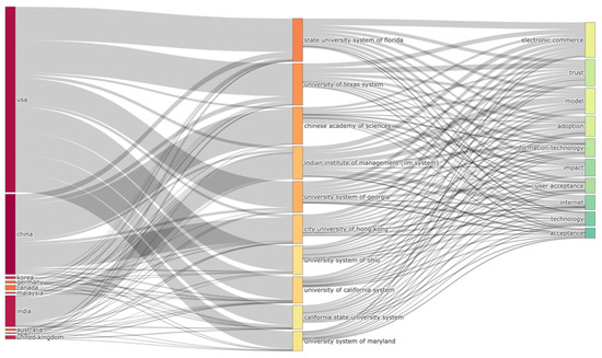 The flow of the diagram indicates the research volume and the connections between the place of research and the content. This shows trends, such as if a particular country’s institutions focus heavily on a certain aspect of e-payment or if a topic is of global interest, signified by multiple countries’ institutions connecting to the same keyword.