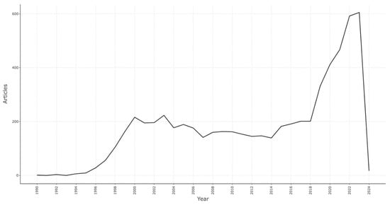 Table 3 summarizes bibliometric data from a search on e-payment topics, as retrieved from the Web of Science database, from 1990 to 2024. The search yielded 6153 documents from 1742 sources, such as journals and books. These documents are characterized by an annual growth rate of 8.69%, indicating a steady increase in publications on this subject over the years. The average age of these documents is roughly 11 years, and each document has been cited 31.8 times, which shows their relevance and impact on the academic community.