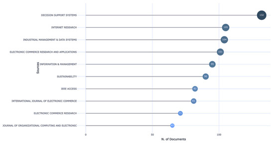 Figure 4 represents various academic journals and their respective contributions to the field of e-payment technology, as measured by the number of documents or papers published. The vertical axis lists the names of the journals, which range from specialized publications like Electronic Commerce Research and Applications to broader journals like Sustainability and IEEE Access. The horizontal axis represents the number of documents published, providing a quantitative measure of each journal’s output in the area of e-payment. The size of the bubble for each journal correlates with the number of documents published—the larger the bubble, the greater the number of publications. Decision Support Systems appears to be the leading source, with the highest number of documents, followed by Internet Research and Industrial Management and Data Systems. These journals strongly focus on the technological and managerial aspects of e-payment systems. Electronic Commerce Research and the Journal of Organizational Computing and Electronic Commerce are more specialized. Still, they also make notable contributions to the field, as indicated by the size of their publications.