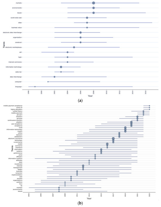 The longitudinal evolution of research topics—from foundational keywords such as “EDI” and “language” in the 1990s to more recent terms like “Fintech,” “P2P systems,” and “COVID-19” in the 2020s (Figure 5a,b)—further highlights the transformation of e-payment from a simple transaction mechanism to a complex digital infrastructure encompassing security, user behavior, and business innovation.