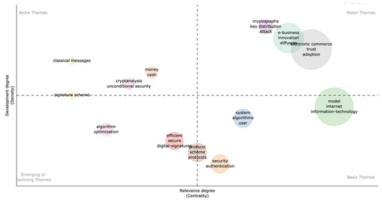 This convergence is particularly evident in the rise of themes like “trust,” “security,” “blockchain,” and “mobile payment,” which have transitioned from peripheral to central positions in the thematic map over time. These now-core “motor themes”—including cryptography, trust, and e-business—demonstrate not only technical sophistication but also a deep embedding within broader social and behavioral contexts. This shift reflects a transition from technology-push models to sociotechnical integration, consistent with contemporary theories of innovation convergence.