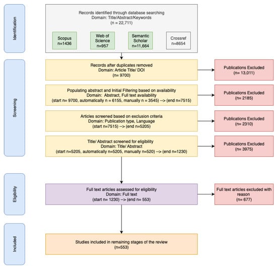 Multiple iterations of the search process were conducted, with each iteration involving comparison of results and refinement of the search procedure to ensure inclusion of a comprehensive set of relevant work. In the final iteration, publications were retrieved from the three databases from 2020 to 2025. This process retrieved 22,711 initial results (Scopus: 1436; Web of Science: 957; Semantic Scholar: 11,664; CrossRef: 8664). Database searches were conducted in March 2025 to ensure consistency in the temporal scope of retrieved publications and citation metrics across all databases. The outcomes of these searches were merged and duplicate entries were eliminated based on Digital Object Identifier (DOI) and title similarity. This de-duplication process reduced the total number of publications from 23,668 to 9700.