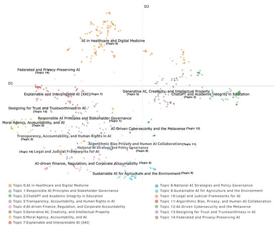 Domain-specific applications of responsible AI principles appear toward the periphery of the embedding space. Topic 0 (AI in Healthcare and Digital Medicine) occupies a distinct region due to its specialized vocabulary and unique regulatory considerations. Topic 2 (ChatGPT and Academic Integrity in Education) forms a separate cluster with its focus on educational contexts. Topics 5 (Generative AI, Creativity, and Intellectual Property) and 4 (AI-driven Finance, Regulation, and Corporate Accountability) maintain peripheral positions with their specialized terminology and regulatory frameworks. Topic 9 (Sustainable AI for Agriculture and Environment) combines environmental concepts with technical approaches, creating a distinct profile. Topic 14 (Federated and Privacy Preserving AI) forms a defined cluster due to its technical methodological focus. The central region contains topics related to fundamental responsible AI principles in a nuanced arrangement. Topic 7 (Explainable and Interpretable AI) and Topic 13 (Designing for Trust and Trustworthiness in AI) appear in close proximity, suggesting a relationship between explainability and trust in AI systems. Topic 6 (Moral Agency, Accountability, and AI) forms its own region, representing philosophical foundations of machine ethics, while Topic 1 (Responsible AI Principles and Stakeholder Governance), a broad research area, occupies a middle position. Topics 12 (AI-Driven Cybersecurity and the Metaverse), 3 (Transparency, Accountability, and Human Rights), and 11 (Algorithmic Bias, Privacy, and Human–AI Collaboration) form a vertical arrangement suggesting a progression from technical security considerations to broader human rights and fairness issues. Topics 8 (National AI Strategies and Policy Governance) and 10 (Legal and Judicial Frameworks for AI) intersect with Topics 3 (Transparency, Accountability, and Human Rights in AI) and 11 (Algorithmic Bias, Privacy, and Human–AI Collaboration), showing how governance and legal frameworks address issues of transparency, accountability, and algorithmic bias. These 15 topics recognize a distinction between principles and practices, with governance approaches connecting foundational concepts and applications. Final topics and article distributions can be found in Table 2.