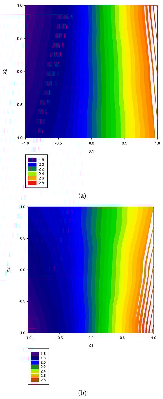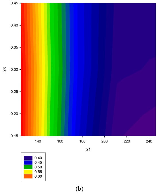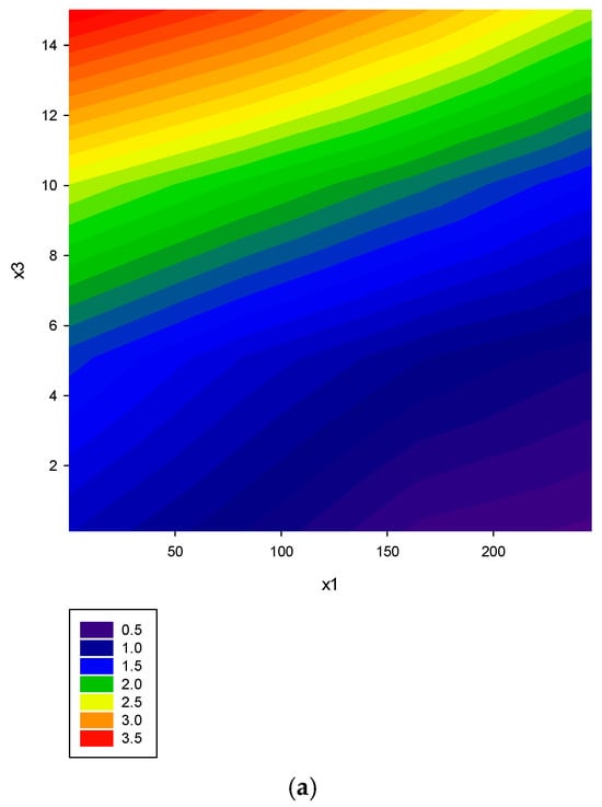Compared with other experimental design methods, the most prominent feature of the response surface method is that it graphically represents the relationship between the influencing factors (variables) and the response value. Contour maps are used to present two-dimensional space. These contour maps illustrate the changes in response value under various influencing factors. Three-dimensional surface response maps represent information in three-dimensional space, with the response value as the z-coordinate and the x- and y-coordinates as the two influencing factors. Suppose the quadratic polynomial relationship does not exist. In that case, this type of contour plot will be drawn as a straight line, and the three-dimensional surface response plot will appear as a stable plane. If the quadratic polynomial relationship is significant, both graphs will be represented by curves. Researchers often use these contour maps to intuitively observe the optimal level of the influencing factors that lead to the optimal response [,,].