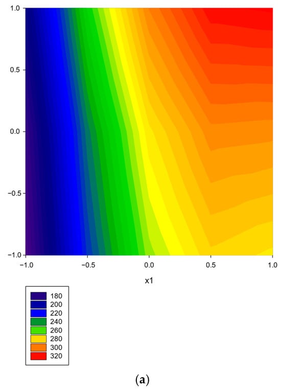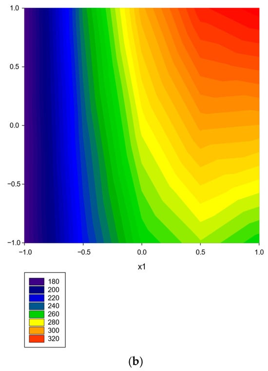 After the evaluation, the appropriate equation (RSM model) establishes the relationship between the response value and the influencing factors as a mathematical function. Among the graphical methods, contour plots and three-dimensional surface response plots are particularly popular among researchers [,,]. The studied techniques are described in detail in this paper [].