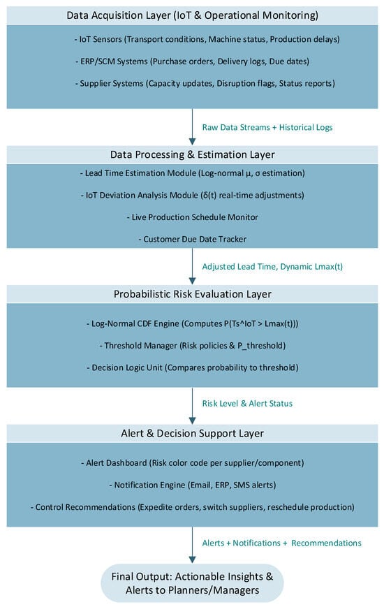 From a practical standpoint, the proposed system offers a robust and scalable decision-support tool for supply chain and operations managers. Its probabilistic architecture strengthens reliability by explicitly quantifying uncertainty, while real-time IoT calibration minimizes false alarms and enhances trust in the alerts generated. When embedded into existing digital infrastructures—such as MES or IoT-enabled control towers—the system can significantly improve operational resilience, reduce costly disruptions, and enhance supplier performance monitoring. These benefits are particularly valuable in high-mix, low-volume industries, where agility, customization, and reliability are central to competitive advantage.