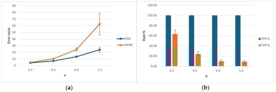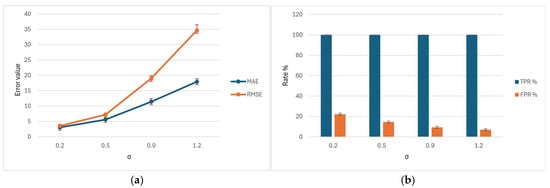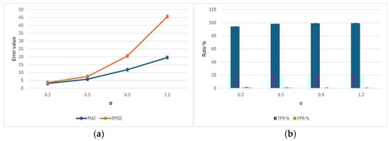 The performance metrics of the BPAS across varying the standard deviation σ. (a) MAE and RMSE. (b) TPR and FPR.