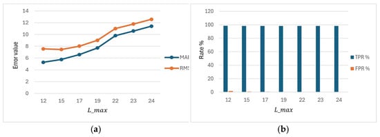 The results presented in Table 5 illustrate how variations in influence the predictive performance of the model across several evaluation metrics. The TPR remains consistently at 100% for all values of , confirming the model’s ability to correctly identify all relevant cases without omission. However, the FPR shows a clear downward trend as increases, moving from 18.84% at = 12 to only 4.48% at = 24. This indicates that higher tolerance levels substantially reduce the likelihood of false alarms.