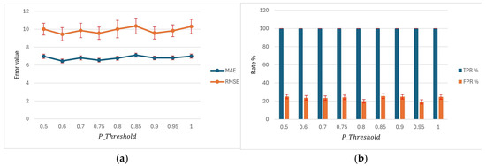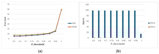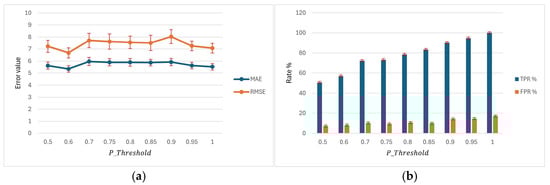 The performance metrics of the BPAS across varying Probability Threshold (a) MAE and RMSE. (b) TPR and FPR.