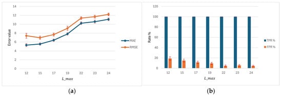 A similar trend is observed in the number of TP and FP. As increases, both TP and FP decrease, reflecting a natural trade-off: while the system remains highly sensitive (TPR = 100%), the stricter filtering reduces the volume of predictions made. The MAE gradually increases with higher values of , from 5.30 at = 12 to 11.09 at = 24, showing that predictions become less precise in terms of absolute deviation. This pattern is further confirmed by the RMSE values, which increase from 7.40 to 12.22, highlighting the higher dispersion of errors when tolerance is extended.