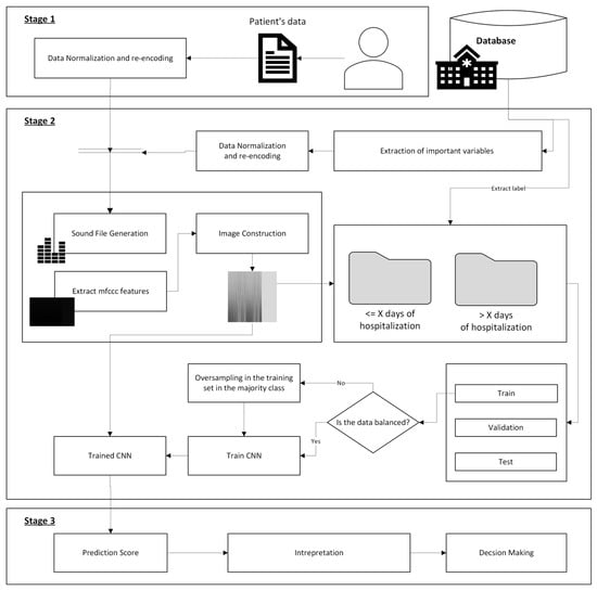 Flow diagram of the intelligent decision support system. It illustrates the progression of information through three stages. Stage 1 involves the collection of patient data and the extraction of relevant clinical variables. Stage 2 introduces a novel data formalization process, transforming inputs into image-based representations for inference using a Convolutional Neural Network. Stage 3 focuses on interpreting the results and generating clinical recommendations.
