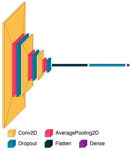 Figure 4 presents the architecture of the proposed model, showing the convolutional layers (Conv2D, shown in yellow), average pooling layers (AveragePooling2D, shown in red), dropout layers (Dropout, shown in cyan), a flattening layer (Flatten, shown in dark blue), and a fully connected dense layer (Dense, shown in purple).